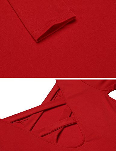 Women's Long Sleeve Cross Back Pleated Loose Swing Casual Dress Knee Length,Red,M