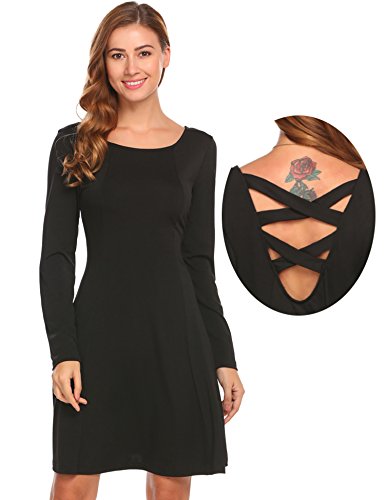 Women's Vintage Cross Back Long Sleeve Round Neck Cocktail Formal Swing Dress,Black,L