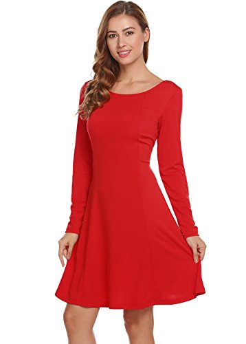 Women Simple Designed Long Sleeve Round Neck Casual Flared Midi Dress,Red,S