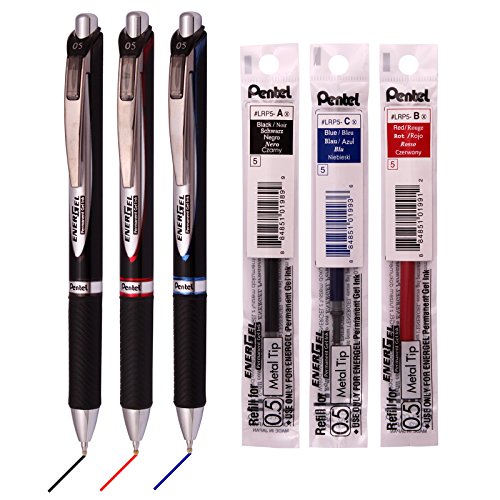 -. Title : Pentel BLP75 EnerGel 0.5mm Retractable Permanent Gel Pen Red,Blue,Black (Pack of 3 Pens) + 1 Black Refill