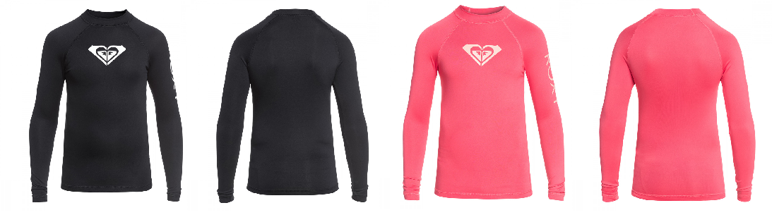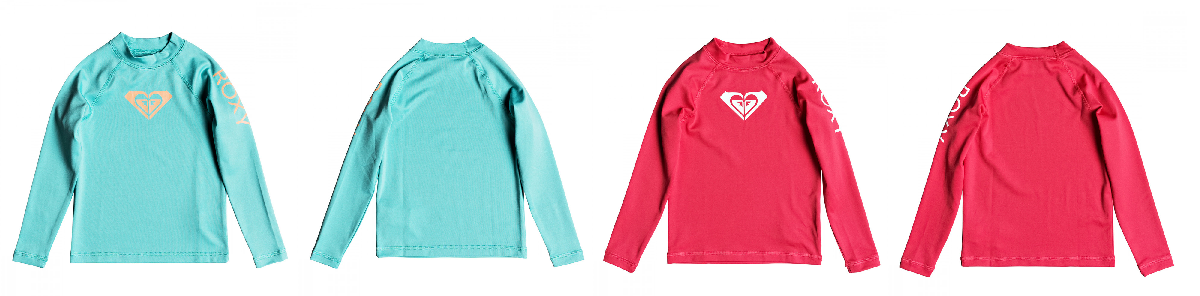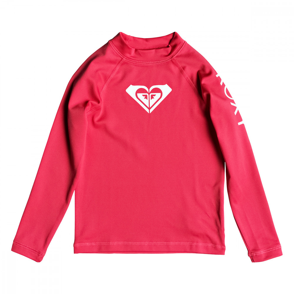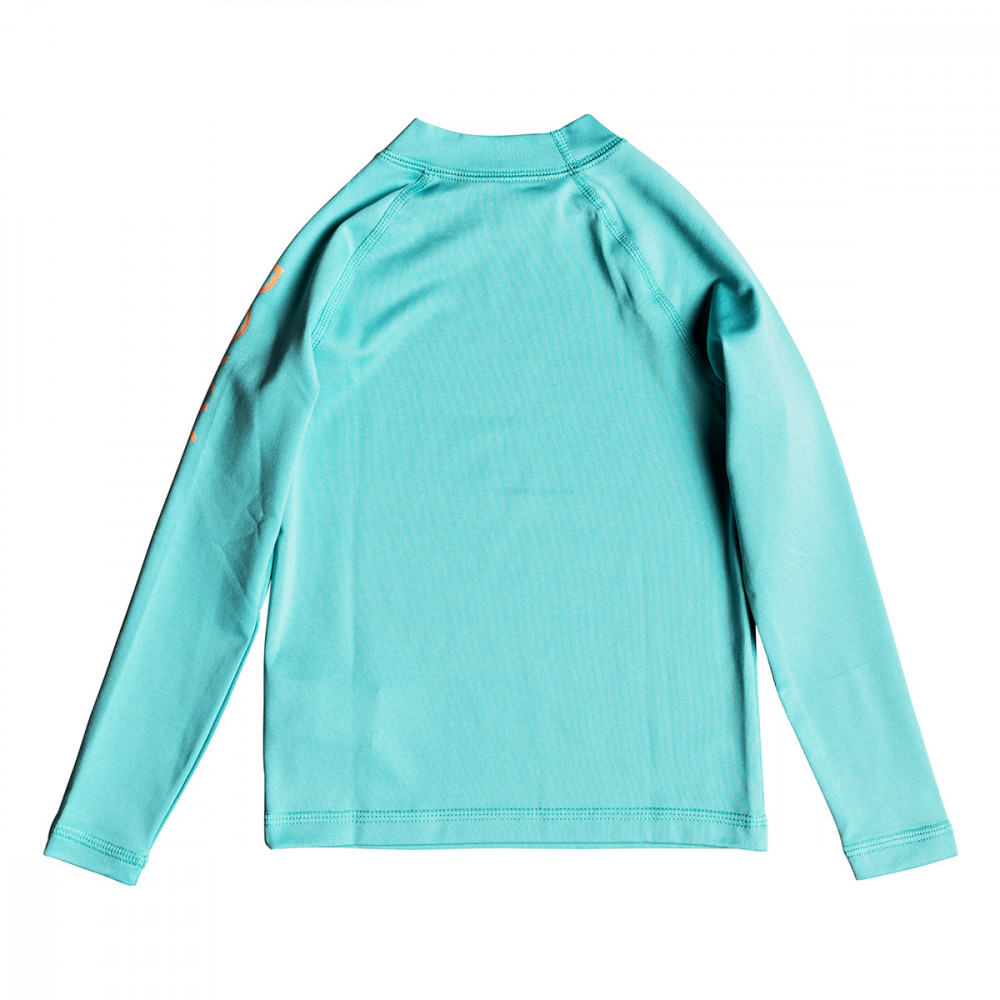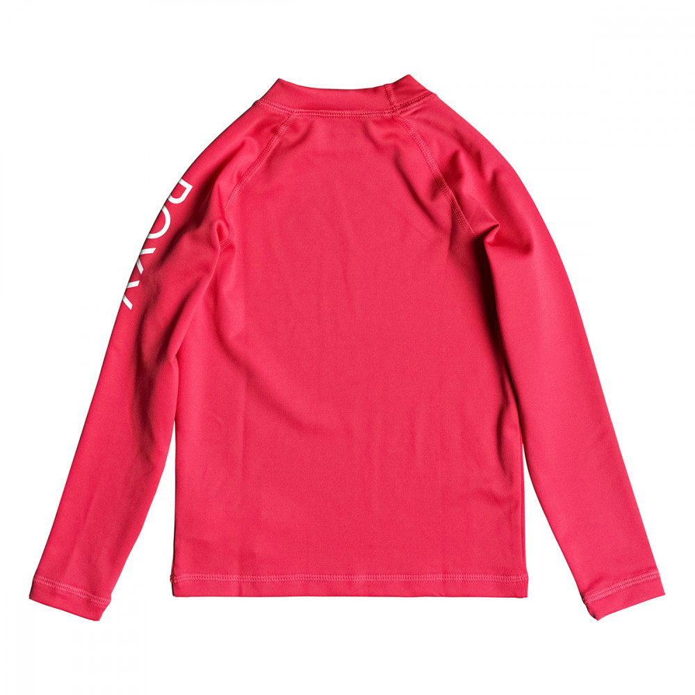 자외선 차단 지수 UPF 50+의 아동용 긴 소매 래쉬가드. 몸에 딱 맞는 핏이며 가슴과 왼쪽 소매에 록시 로고가 프린트되어있습니다.
