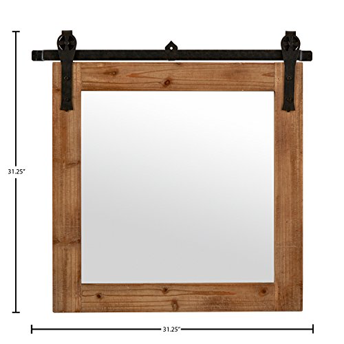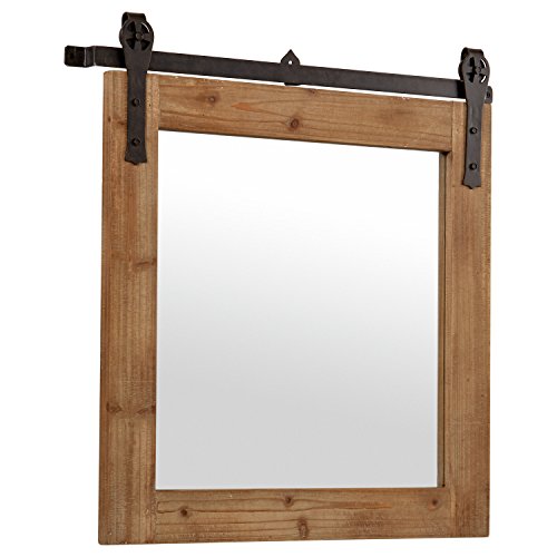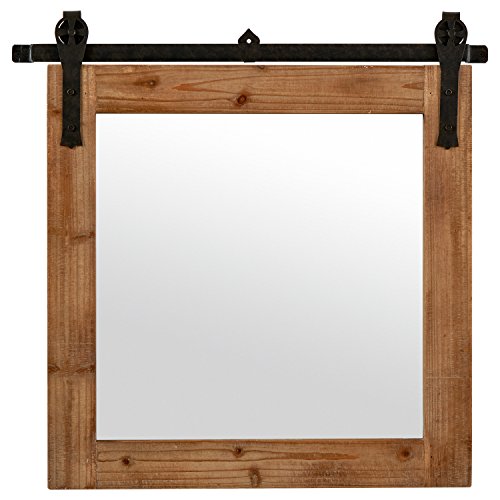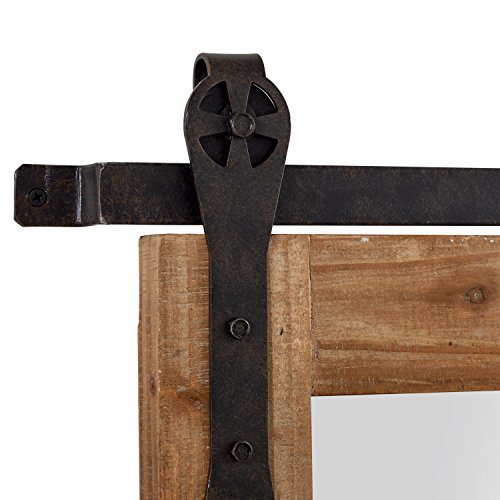 A simple mirror gets a clever twist, thanks to sliding barn-door hardware. Housed in a natural-look wood frame and mounted on a black iron rod, this mirror will be a conversation piece enhancing any casual, relaxed style room.
