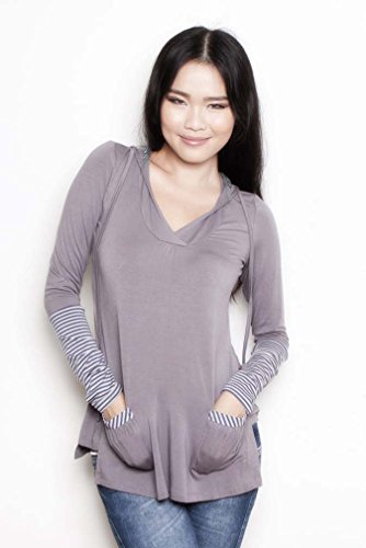 Cute, dual-colored hoodie with shell pocket. Lift front panel to nurse from nursing openings in the inner piece. Double in front only. Can be worn both during & after pregnancy for easy breastfeeding. This item runs a little on the small side. Nursing Access: Lift front layerMaterial: Rayon, spandexFeature