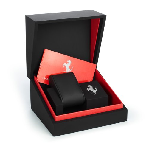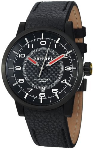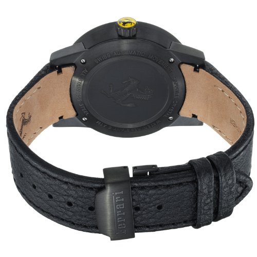 -. Feature : Swiss made watch with black PVD coated stainless steel case, 42 mm diameter, 11 mm thick, Black leather strap, Deployment buckle / Black dial with carbon fiber center, Silver-tone red filled hands, White Arabic numerals and silver-tone indices / Date window at the 6 o'clock position, Anti-glare scratch resistant sapphire crystal / Crown displays the Ferrari logo of the famous Prancing Horse with a yellow background / Swiss automatic movement, ETA caliber 2824, Power reserve of 42 hours, Water resistant to 5 ATM/50 meters/165 feet