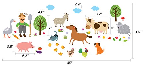 - Size: 44 items on 2 sheets of 11,8" Х 15,8 " for farm decals. Total dimensions for animal wall decals when stick please see on a picture. Each element of barnyard decals sticks separately. SAME BRIGHT COLORS AS ON A PICTURE for farm pig decal