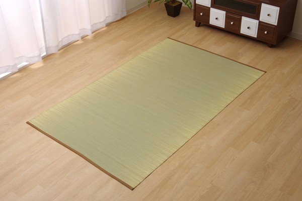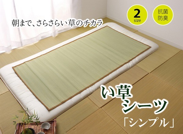い草シーツです。1シーズンしか使わないお客様には、とってもおススメです。い草の効能として1.綿の約2.5倍の吸湿力 2.蒸れにくい。汗による湿気を吸うことにより温度を下げ快適な就寝を促します。 3.汗のにおいを軽減。汗のにおいの元となる化学物質を90%以上抑えます。などがあります。比較的短めのい草を使用しています。そのため、両サイドが白(茶色)っぽくなっております。(日焼けではありません。い草の根元と先端部分の色です。)予めご了承下さい。イ草表面に青森ヒバ加工を施しています(抗菌・防臭効果)。青森県のヒバの木から抽出した「ヒバ油」をメーカー独自の技術で材料や商品に加工しました。「ヒバ油」には、ヒノキチオールという天然物質としては極めて抗菌性の高い成分が含まれ、医療や食品など多分野で利用研究が進められています。※自然素材であること、また職人が一つ一つ手作業にて加工を行うため、形状のバラつきや表示サイズと多少異なることがあります。ご了承下さい。