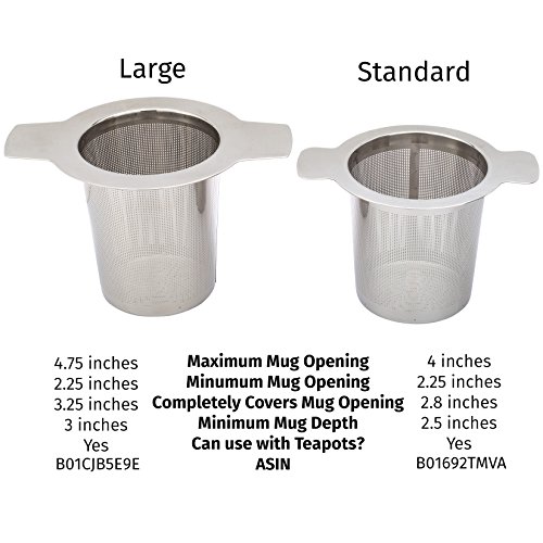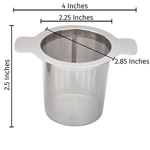 ? EXTRA FINE MESH - The fine mesh filter will keep the tea leaves out of your drink. Great for brewing fine loose leaf tea such as Rooibos, Oolong, Teavana & more. The tea strainer fits mugs with openings between 2.25-4 inches and that are at least 2.5 inches tall.