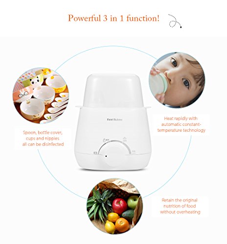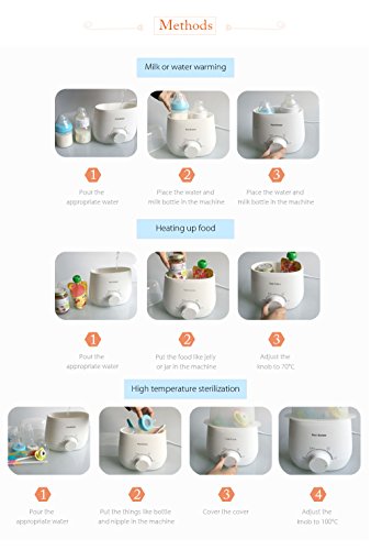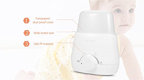 -. Feature : THREE IN ONE FUNCTION - Warming, heating, and disinfection, three in one function for warming milk, heating food and sterilization, intimate dust-proof cover can prevent the mosquito and dust from entering. / DOUBLE BOTTLES - Double bottles design, you can heat up water and milk food at the same time. Efficient PTC heating body and low energy ensure a speed for 5 minutes. / SAFETY - Precise thermostat technology can be heated automatically and evenly, and it would stop warming / heating when there is no water, moreover, BAP free material helps to ensure your safe using. / EASY OPERATION - Simple operation with the only knob makes things convenient, you could save more time and enjoy your happy time with your sweet little one. / WELL DESIGN - Transparent dust-proof cover, wide bottle rack, safe PP material, this item can disinfect spoon, bottle cover, cups, nipples and so on.