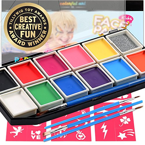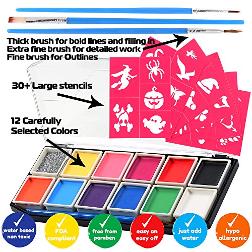 Award Winning Face Paint Kit For Kids | Professional 12 Color Mega Palette | Best Body Face Painting Kits | 3 Brushes, Glitter, 30 Stencils, Durable Case | Fda Compliant Non Toxic | Bonus Online Guide