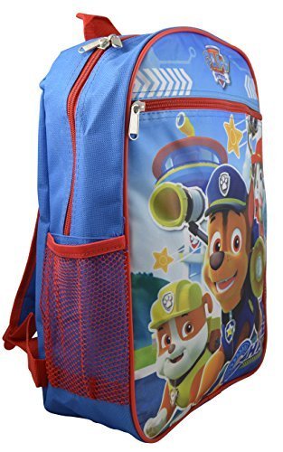 -. Binding : Baby Product -. Brand : Nickelodeon -. Color : Blue/Red -. Department : boys -. EAN : 0708325399204 -. Feature : Brilliant colors for dazzling lunch time fun. Perfect for school and vacations! Well known characters that your child will love having with them. The perfect all year round! Adjustable padded shoulder straps for additional comfort. / Two elastic net side pockets for water bottles and school supplies / One large zippered compartment for binder, books and folders / One Front zippered pocket / Made of an easy to clean and very durable polyester -. ProductGroup : Apparel -. ProductTypeName : BABY_PRODUCT -. Size : Large -. Title : Nickelodeon - Paw Patrol Kid's 15" School Backpack Travel Bag -. UPC : 708325399204