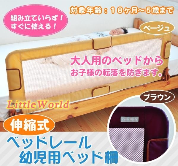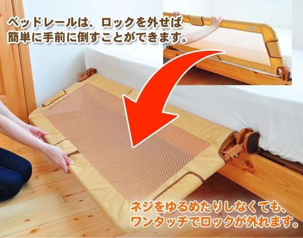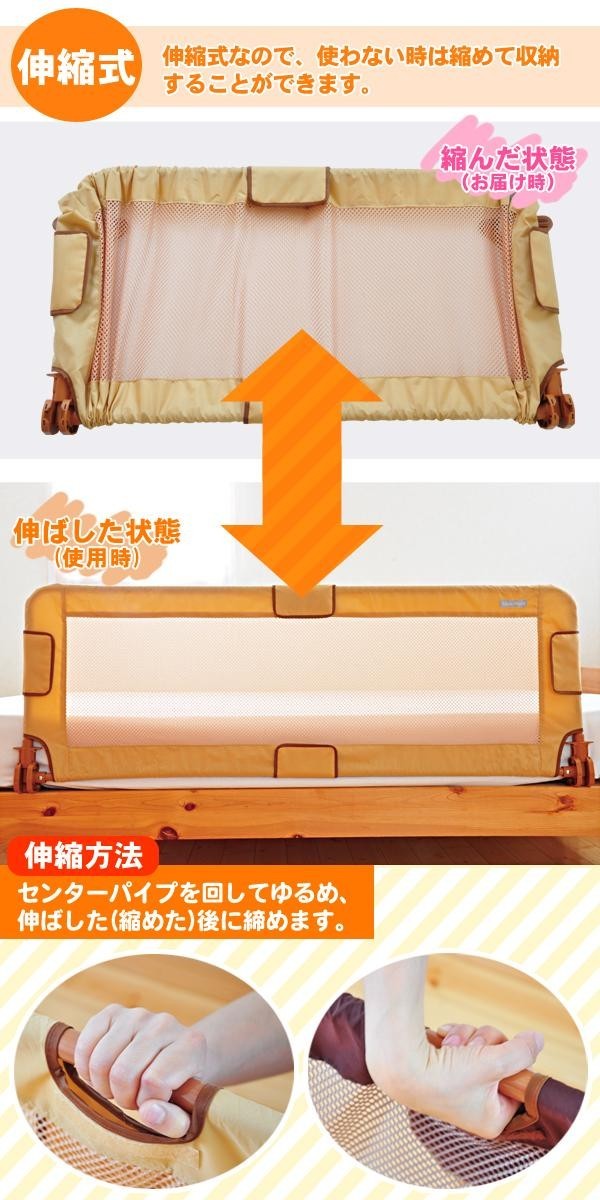 | 大人用のベッドからお子様の転倒を防ぐロングサイズで組み立ていらずの伸縮式ベッドレール。高さは約51cm、幅が約140cmとハイ&ワイド設計で広範囲をカバー。またネットを使用しているので、転がってぶつかっても痛くなく、視認性と通気性にも効果があります。伸縮式なので、使わない時は縮めて収納することができます。マットレス下への差込部分はワイドストッパーで抜けにくく、安定感があります。(特許取得済) |