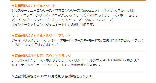 ●装着可能なチャイルド&ジュニアシート:ジョイトリップシリーズ(※ジュニアモード・ブースターモードではご使用になれません。※ランバーサポートとの併用はできません。)装着可能なハイ&ロースウィングラック:フェアレットシリーズ・ネムリラシリーズ・リシェナ・ルシエス AUTO SWING・ネムリス※インナークッション(ダッコシート)との併用はできません。