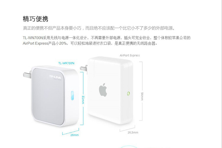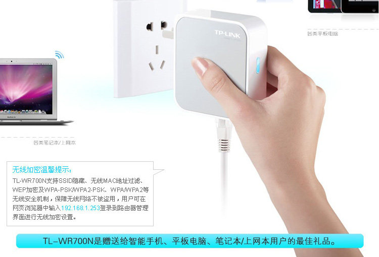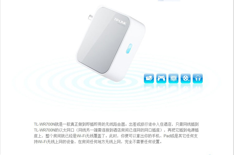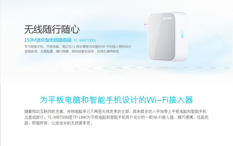 TL-WR700N can not only widely compatible with 11b / 11g / 11n wireless card, but to work with Wi-Fi phones, tablet PCs, laptops, netbooks good compatibility to provide a stable Wi-Fi phones, tablet PCs, notebook computers, high-speed wireless network.