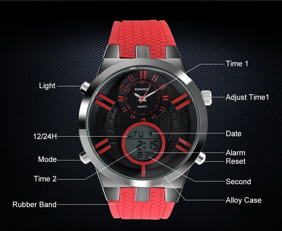 Feature:Water Resistant,LED display,Multiple Time Zone,Stop Watch,Complete Calendar,Shock Resistant,Chronograph,Perpetual Calendar,Auto Date,Alarm