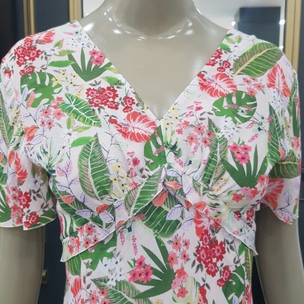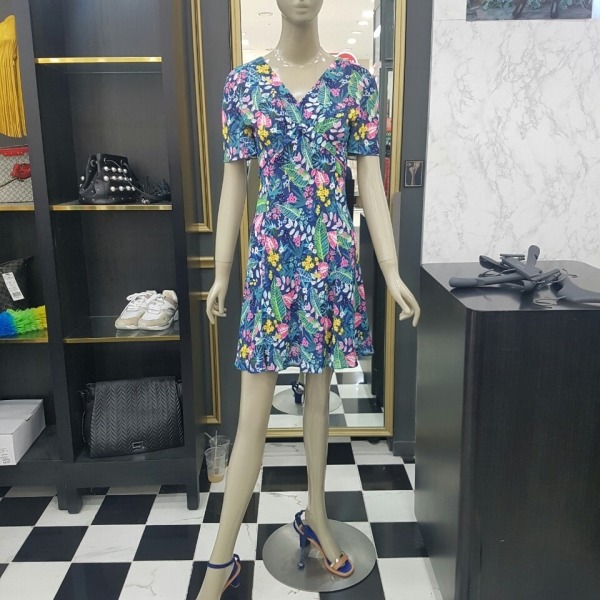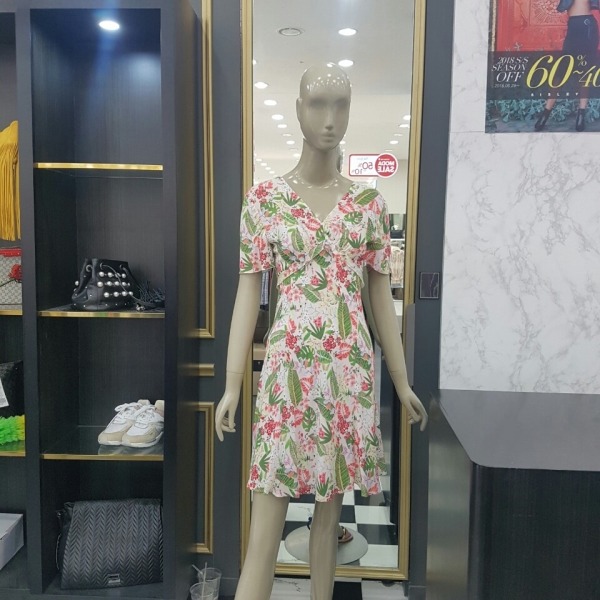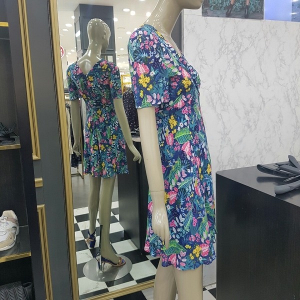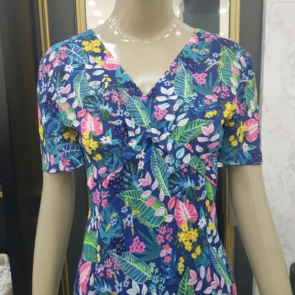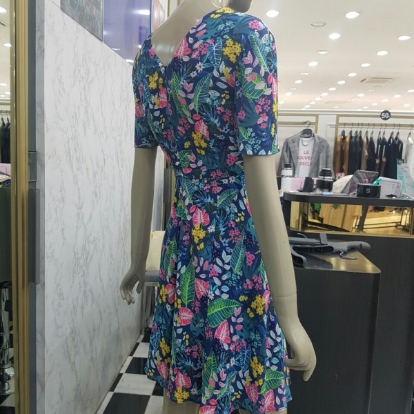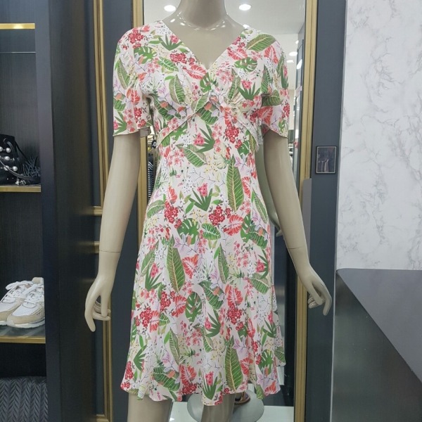 화사한 플라워 프린트에 허리선이 위에 있는 하이웨스트 스타일이라 날씬해 보이는 브이넥 원피스입니다