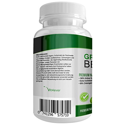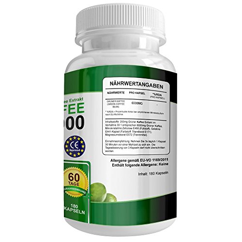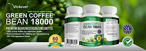 -. Feature : 100% Grüner Kaffee aus natürlicher Quelle / 60 Tage Kur (180 Kapseln) / Extra hochdosiert mit 18000mg pro Tagesdosierung / Zur Unterstützung während der Diät & Gewichtskontrolle / 50% Chlorogensäure Gehalt