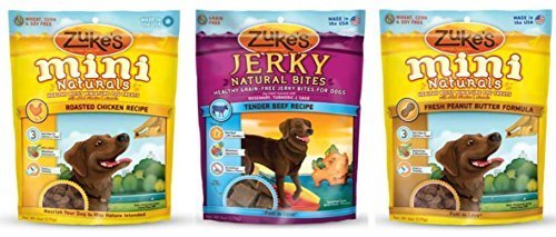 -. Title : Zuke's Naturals Healthy Dog Treats 3 Flavor Variety Bundle: (1) Zuke's Mini Naturals Healthy Moist Roasted Chicken Recipe, (1) Zuke's Naturals Healthy Grain-Free Tender Beef Jerky Bites, and (1) Zuke's Mini Naturals Healthy Moist Peanut Butter Formula, 6 Oz. Ea. (3 Bags Total)
