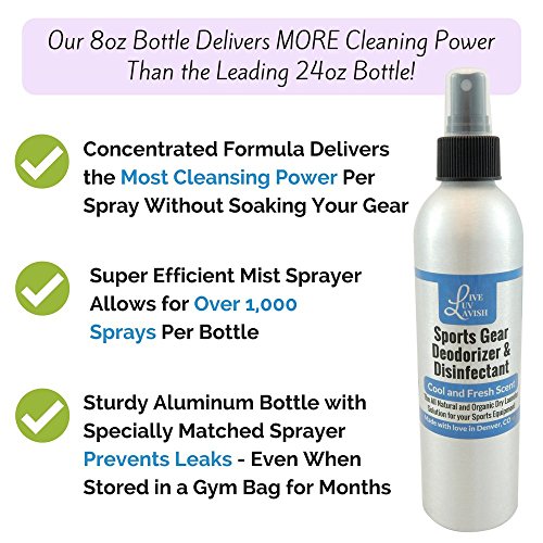 -. Feature : While other sports cleaners are watered down and do not get rid of all smells our Sports Gear Cleaner is a CONCENTRATED all natural formula packaged in a super EFFICIENT spray bottle so that more disinfectant is delivered without soaking your equipment. This means more cleanings per bottle compared to larges sized bottles full of filer ingredients. It also allows your equipment to be dry and fresh in time for tomorrow's practice. / GET THE STINK OUT of your kid's hockey, football, soccer and other sports equipment and keep that sports funk from infiltrating your car and home. Effective on helmets, gloves, shoes pads, shin guards, mats, gym bags and more. / Keep them safe by using this spray that ELIMINATES BACTERIA, FUNGUS, AND MORE from the items that touch their skin daily. Our antimicrobial, antifungal, and antibacterial spray harnesses the power of all natural ingredients that kill the origin of the smell instead of just covering it up / Come in the PERFECT SIZE BOTTLE that can be stored at home or in a gym bag or the car so that equipment can be cleaned at whatever point is most convenient. By choosing our 8oz concentrated odor eliminator with specialized sprayer you get HUNDREDS OF CLEANINGS, much more than you get from a larger cleaners that uses filler ingredients. / We believe you deserve effective, high quality, all natural products from a company you can trust. This is why we design ALL NATURAL products that are free from chemicals, toxins and artificial smells and focus on transparency by listing all ingredients on every bottle. It is also why our mission is to provide the BEST CUSTOMER SERVICE around and offer an unlimited SATISFACTION GUARANTEE. We are not happy until you are!
