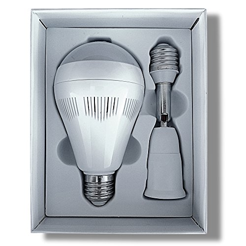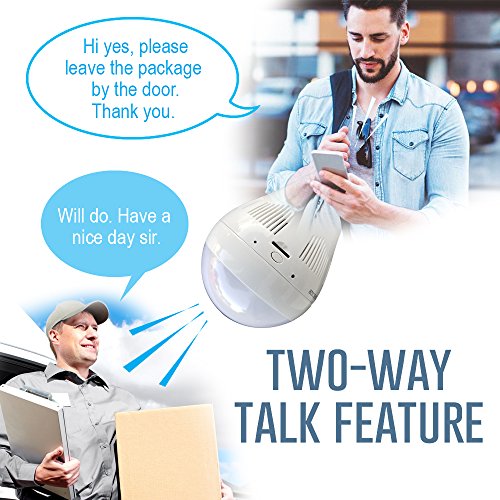 -. Feature : 💡360° PANORAMIC VIEW & 1080P FULL HD: Equipped with 185° wide fisheye lens,NuCam light bulb camera gives you well coverage of the entire room to monitoring each and every corner of your home and office. The recorded 1080P full HD Is very clear. Record and play videos on the timeline with frames extracted in multi-display mode. / 💡MOTION DETECTION: When any motion is detected, NuCam 360 will send alert message with picture capture to your mobile phone via app, offering more security for your place. / 💡EASY INSTALLATION: Twist NuCam into any E27 standard light socket, download the app, pair with your 2.4G Wi-Fi and set up your account. Then it begins to perform flawlessly. Without montly cloud fee, videos can be saved into up to 128Gb microSD card. The 3W LED light can be set to turn on manually from the app or turn on automatically in the dark. / 💡TWO WAY TALK: The built-in ultra-responsive microphone and speaker allows you to have clear conversations with your family members through the mobile app or deter unwanted guests / 💡SATISFACTION GUARANTEED: 30-Day Money Back and 1 year hassle free technical support from a US company, package also includes an adjustable connector E27/E26.