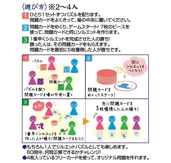 | お題は全部で60問!7枚のピースでお題のシルエットを作ろう!問題レベルは3段階あるので難易度の調整が可能。対戦はもちろん、1人でシルエットパズルとしても楽しめます。フリーカード4枚付なのでオリジナル問題も作れます♪ |
