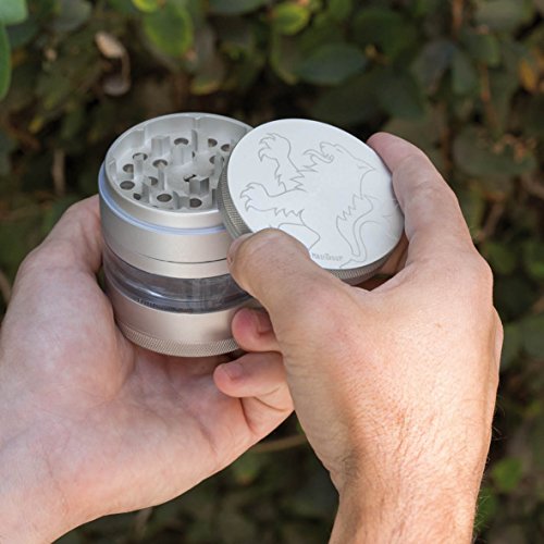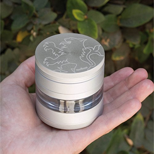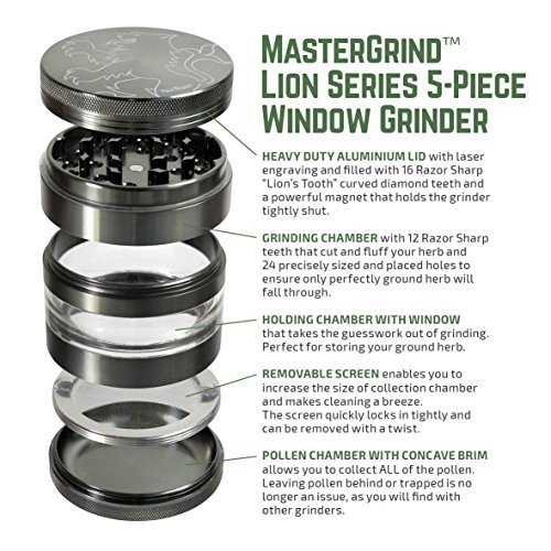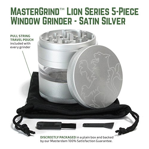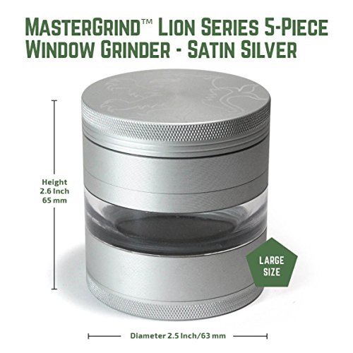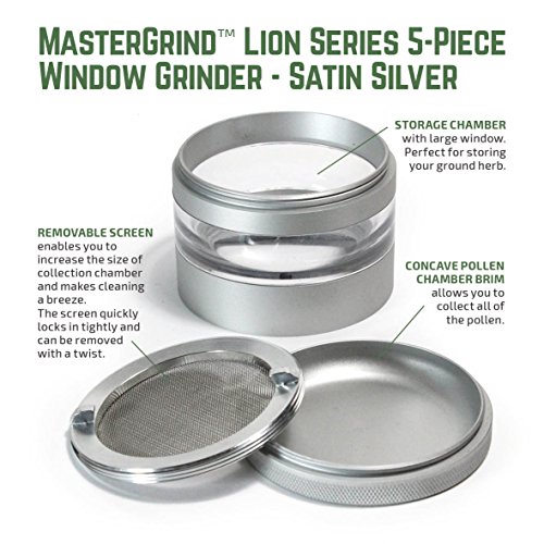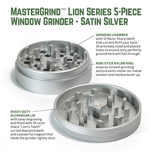 MASTERDAM GRINDERS - MASTERGRIND LION SERIES 5-PIECE GRINDER Our MasterGrind Lion Series Grinders feature a see-through window and removable screen, making grinding easier and cleaning more convenient. While our razor sharp curved Lion's Teeth and precise hole pattern, ensure you will get the perfect grind every time. Get the Best in Quality Premium Features. We're confident you won't be disappointed! Color: Satin Silver Size: 63mm (2.5 Inch) Diameter Features ? 5-Piece Window Grinder Design - Features clear viewing window into the collection chamber and manufactured with premium materials, including Aerospace Grade Aluminum parts. ? The Sharpest Teeth - Often imitated, never duplicated, our exclusive "Lion's Tooth" shape curved diamond teeth cut and fluff the herb into small pieces perfect for rolling. Our grinders increase the surface area of your herb so you get a more even smoke and in turn have less wasted product. ? Removable Pollen Screen and Rounded Pollen Chamber - The removable screen offers dual-purpose functionality, making cleaning easier or enabling you to enlarge the collection chamber. The rounded brim in the base chamber makes pollen extraction easier than on any grinder. ? Powerful Neodymium magnetic lid and Non-Stick Nylon O-Ring - Keeps lid freely rotating while keeping all parts together, so you don't lose any of your precious cargo, even when on the move.