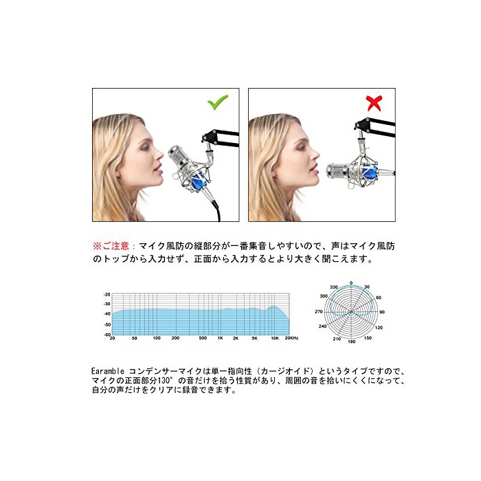 【단일 지향성】카 지오 이 드 이라고 하는 타입 때문에,마이크의 정면 부분130°의 음만(만큼,수록)을 줍는 성질이 있고, 주위의 잡음을 줍기 어려워 되고, 자신인 말만(만큼,수록)을 녹음에 옵니다.(주파수 특성:20Hz - 20KHz)
