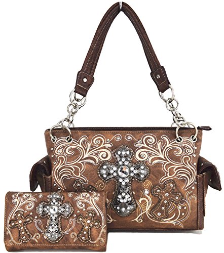 Title : Western Cowgirl Concealed Carry Cross Rhinestone Purse Handbag Messenger Shoulder Bag Wallet Set Brown