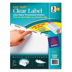 --- Clear labels virtually disappear on white tab so only printing gets noticed. For use in standard ring binders. Print labels using a laser or inkjet printer for a professional-looking index. Tab Style: 3-Tab; Tab Color(s): White; Index Divider Size: 11 x 8 1/2.