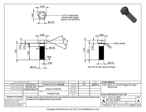 Allied Titanium 0005232, (Pack of 3) 3/8-24 X 1-1/4 UNF Titanium Hex Head Bolt, Grade 5 (Ti-6Al-4V)
