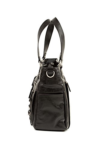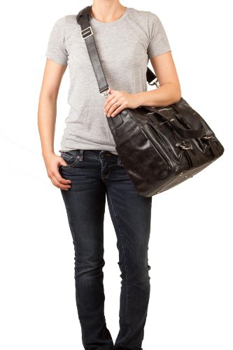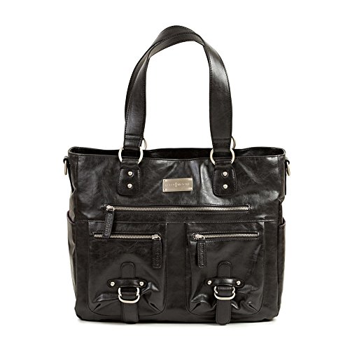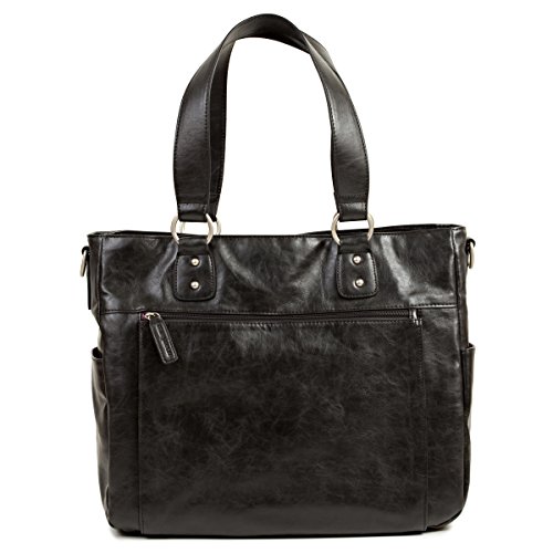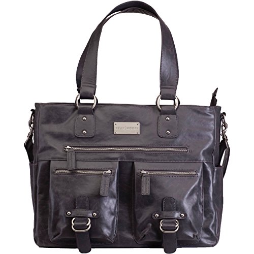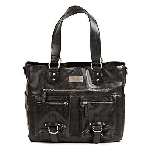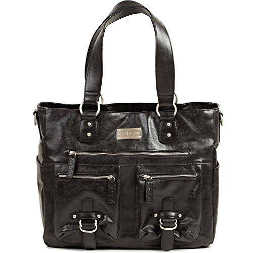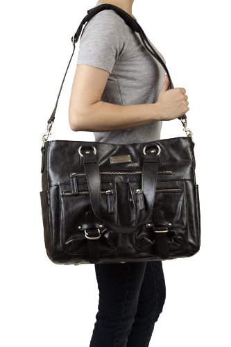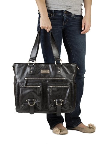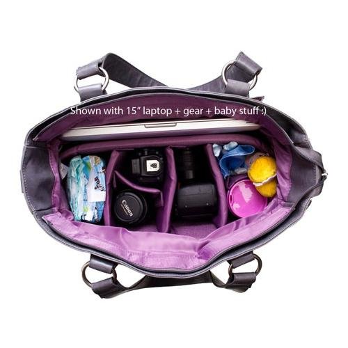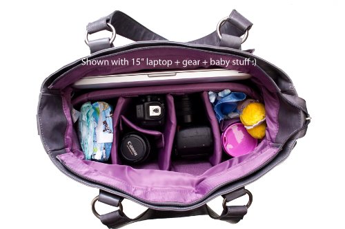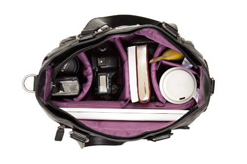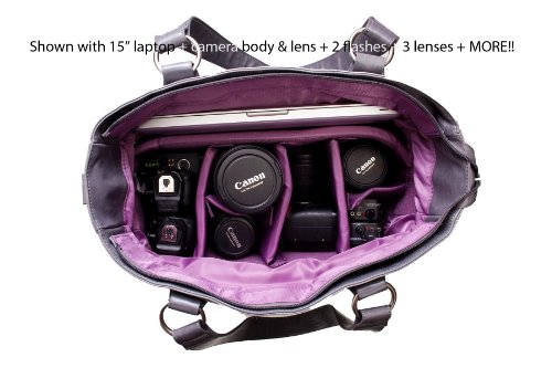Product Description This convertible camera/handbag is fashion and function combined in every design. The outside of the Libby features two 6.5" x 7.5" front zipper pockets, one 10.5" front zipper pocket, one 11" back zipper pocket (will fit ipad), and two 6.5" x 8.5" side open pockets. The inside includes: 3 large padded, removable, adjustable dividers creating 4 sections inside the bag for gear; 3 small padded, removable, adjustable dividers creating 4 sections inside the bag for gear; 1 removable laptop divider; and padded exterior walls and bottom. This bag can carry lenses up to 10 inches in height; phone, keys, flash, baby gear, lenses, camera; an ipad in the outside back pocket; up to a 17" laptop; and a standard camera body with or without grip. There are two over the shoulder straps (11" height) and one removable long messenger strap (up to 56") with shoulder pad. It is made of water resistant, man-made materials and brass or silver hardware. It can stand on its own and weighs 4.5 lbs. 0