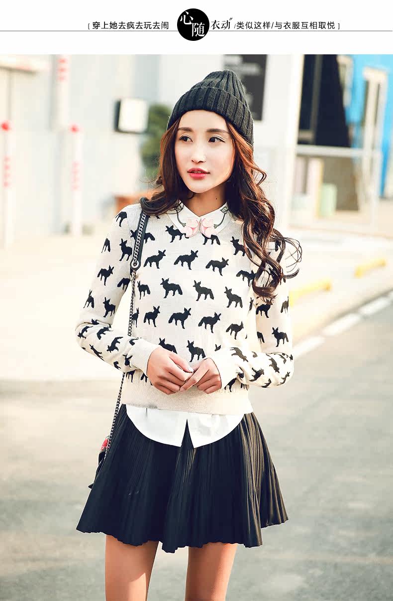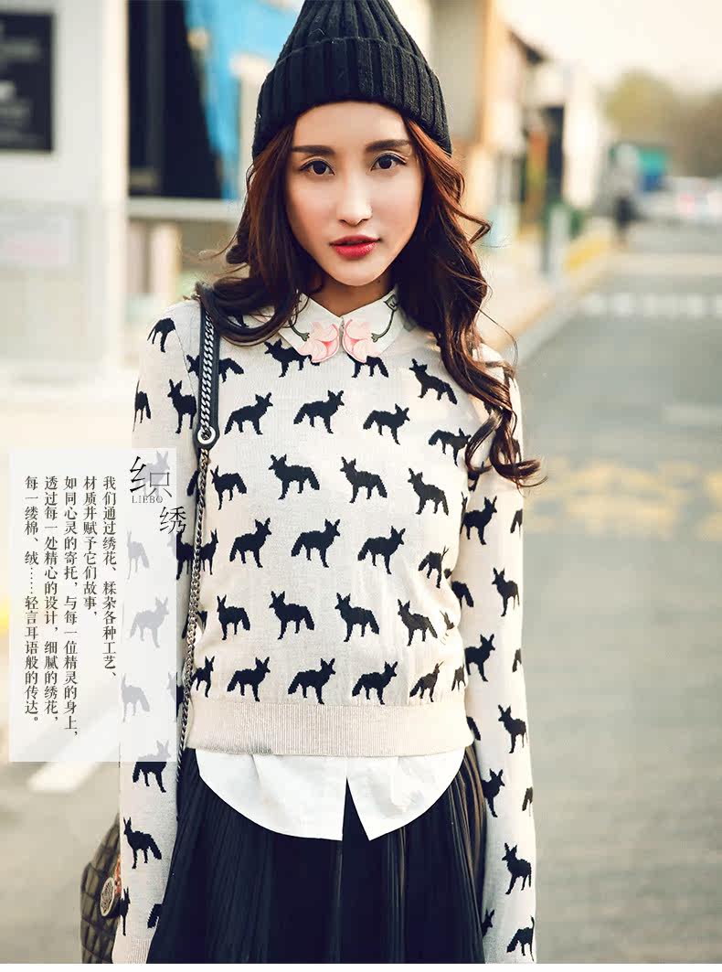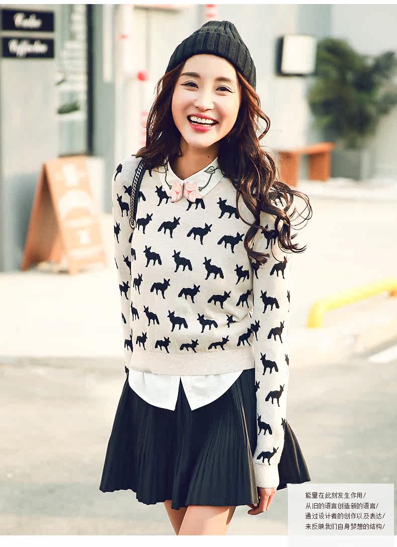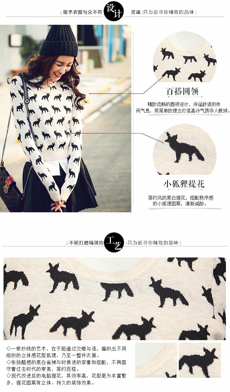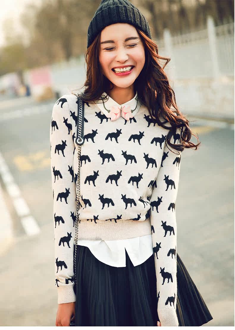圆领小狐狸印花套头针织衫