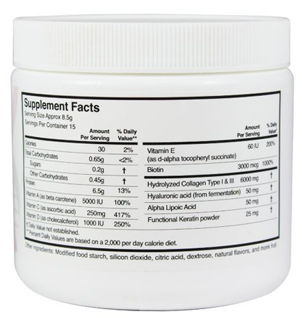 -. Feature : Collagen Types I & III / Keratin, biotin, hyaluronic acid for hair, skin and nails / Sweetened with monk fruit, No added sugar or artificial flavors / Powder form easy to mix with juice or water / Tangerine Flavor