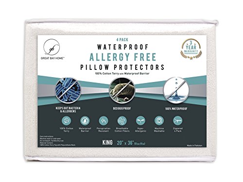 4-Pack Premium 100% Waterproof Allergy Pillow Protectors. Hypoallergenic Dust Mite & Bed Bug Resistant 100% Cotton Terry Zippered Pillow Covers. By Great Bay Home Brand. (King)