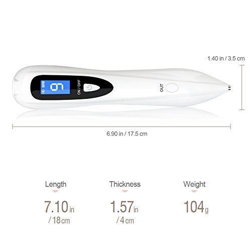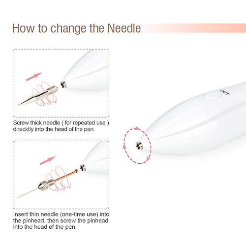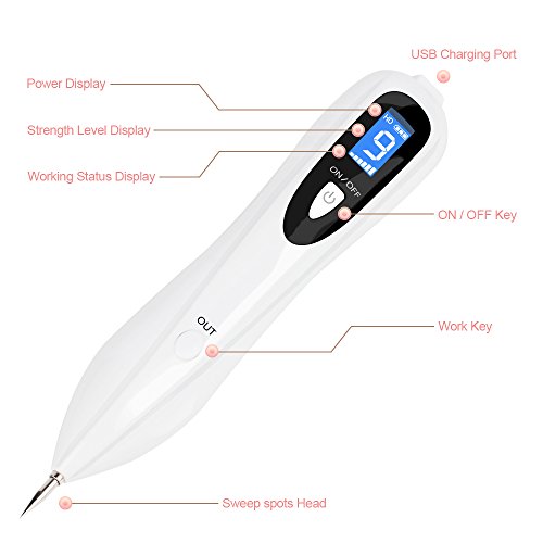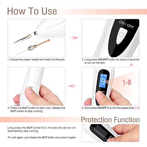 - ✔ EASY TO USE: This mole removal pen is not a complicated product. Just insert the needle, turn on this freckle remover, and choose the strength level you want. Press the OUT button and tap the target area of skin to work through the blemish. This device will keep working when you keep pressing OUT button, but it has power-off protection if you keep pressing it over 2 min once.