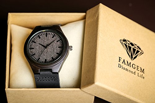 -. Feature : Lightweight & Back to Nature - At less than 1.12 ounce, this watch is so lightweight you'll forget it's there. Our Wood Watch is Lightweight & Extremely Comfortable on the Wrist. The watch comes in an ECO-Friendly box, Perfect for giving to any loved one, or simply yourself. / Fashionable & Unique Casual Style - Why settle for an ordinary look when you can have your own distinct style? Each Famgem Men's Wooden Watch has real grains that will give you a refreshing look and an extra-ordinary vibe. / Made from Real Wood: This unisex wood watch is made of 100% real ebony wood; with no harmful chemicals or paints were used. This combination gives off a contrasting color that gives off a red masculine look. It is safe on the skin and won't cause any rashes or irritation. The strap is made from 100% authentic leather. It's soft and comfortable and adjusts to fit most any wrist. / Precision Quartz Movement - This wood watch women is equipped with precise japan quartz watch movement, developed in Japan and considered to be one of the most reliable and versatile watch calibers in the industry. Ultra-Quiet, Long-Lift Time. / Quality Guarantee: Each Famgem watch is guaranteed to provide you with long-lasting enjoyment, with a modern style that's made from the highest-quality sourced materials.Because of the nature of these items, unless they arrive damaged or defective, I can't accept returns for: Custom or personalized orders.