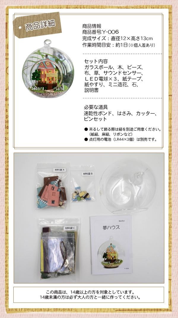 | セット内容 | ガラスボール、木、ビーズ、布、草、サウンドセンサー、LED電球×3、紙テープ、紙やすり、ミニ造花、石、説明書 |