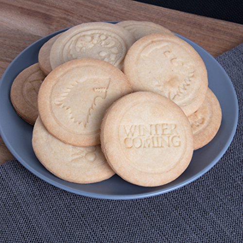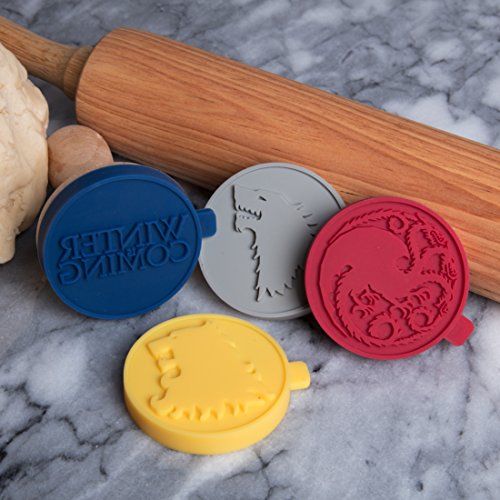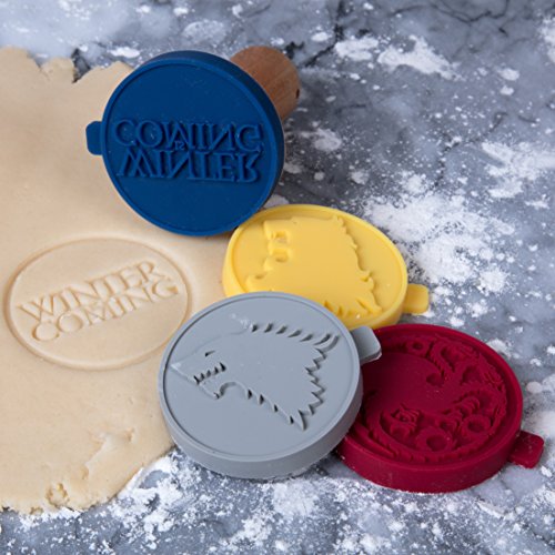 Studio : Katalyst Publisher : Katalyst Binding : Kitchen Product Description Game of Thrones Officially Licensed Cookie Stamp Set of 4 is a perfect gift to any game of thrones fan. Or throw a party and put out your favorite house in cookie form! Each Stamp measures about 2.25 inches - Perfect for any kind of cookie. The set of 4 comes with House Sigils "Stark", "Targaryen", "Lannister", and "Winter is Coming" stamps. Interchangeable templates are easy to use and store, Included wooden handle and 4 food grade silicone stamps. 0