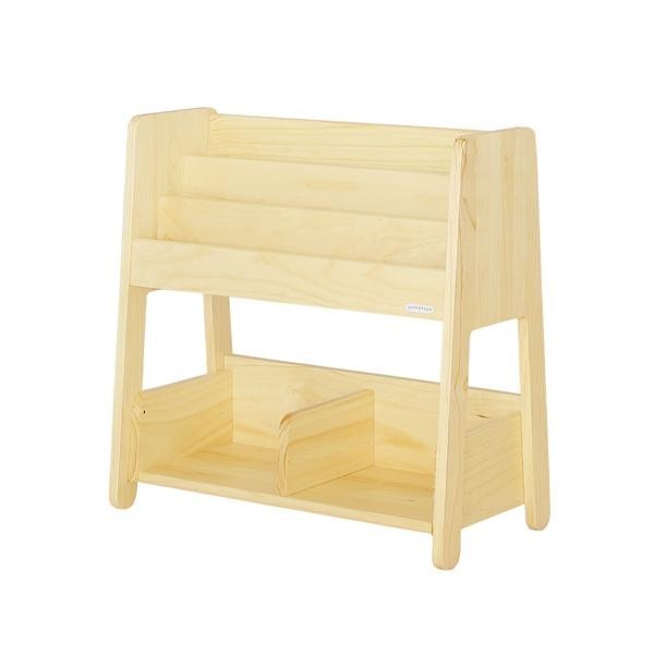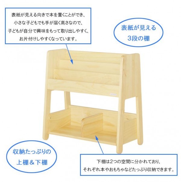 子どもが自分で取り出しやすく片付けやすい仕様のブックラック。上部は3段に分かれ、本の表紙が見える向きで置くことができます。下部には本やおもちゃなどたっぷり収納可能。手の届くサイズ性と収納力が魅力です。 |