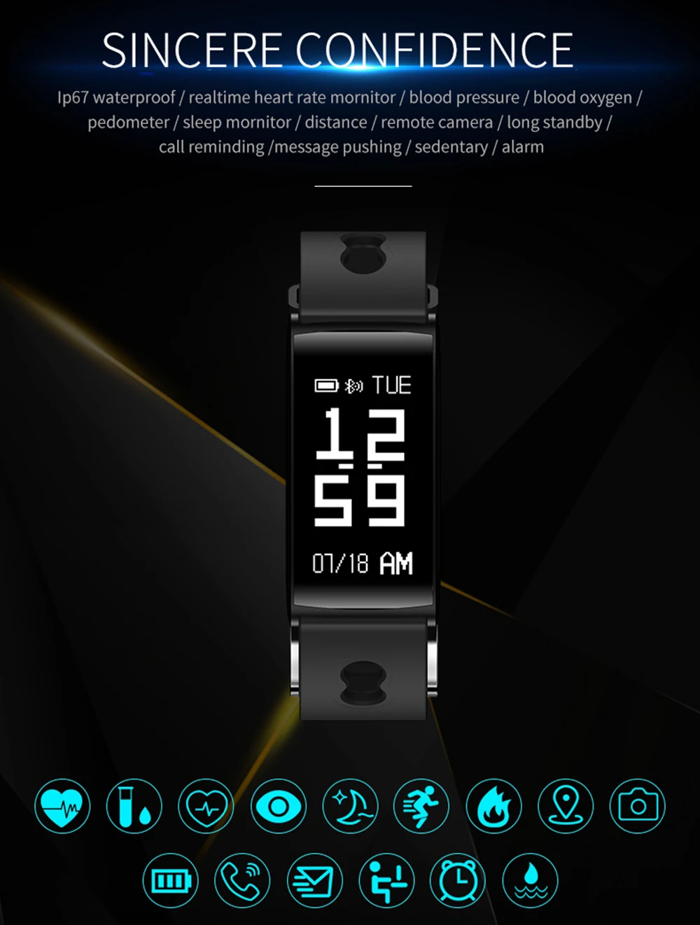 Function:Blood Pressure,Passometer,Sleep Tracker,Push Message,Blood Oxygen,Heart Rate Tracker,Alarm Clock,Remote Control,Activity Tracker,Fitness Tracker,Social Media Notifications,Message Reminder,Week,Call Reminder