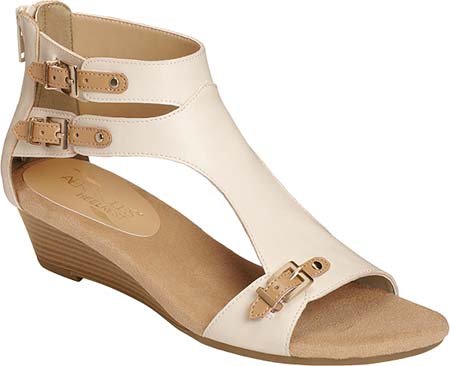 Mini buckles against bold straps give this modern t-strap sandal a hotter than hot look. 1½" stacked wedge heel offers the ideal height for casual wear. Heel rest technology and a memory foam footbed for an extra dose of Aerosoles comfort.Feature