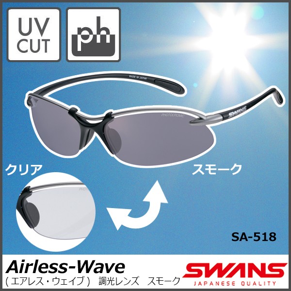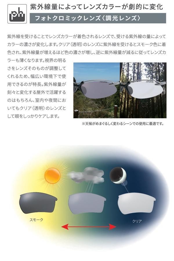| 仕様 | ●フレームカラー:マットチタンシルバー×マットブラック ●レンズカラー:調光クリアtoスモーク(CSK) ●可視光線透過率:84~13% ●レンズ:8カーヴ ●紫外線透過率:0.1%以下 |