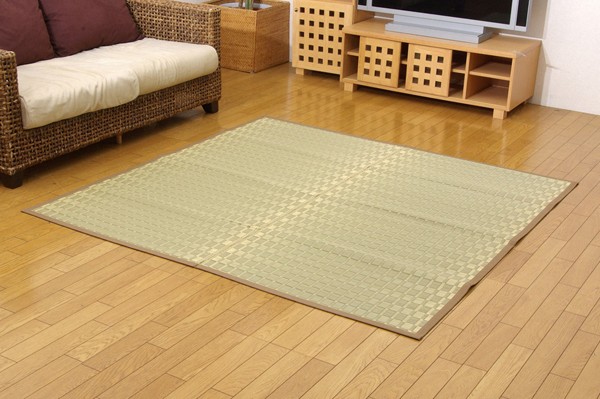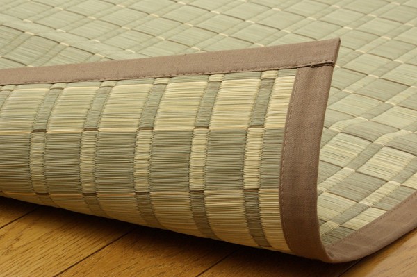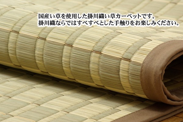 ナチュラルで落ち着きのある花ござです。掛川織は九州筑後地方の伝統的な織り方です。大きな目と小さな目に交互に織り込んだ美しく洗練されたモダンなデザインが人気です。また、厳選された良質の太く長いイ草を高密度に織り込んでいますので丈夫で耐久性があり、しかも素足に心地よいクッション性とボリューム感があります。国産(九州産)のい草を使用しています。一本一本が太く、表皮が厚く繊維がキメ細かいので弾力性があり、耐久性に優れています。い草には空気の自然浄化作用、湿度の調節作用などがあります。また汚れにくく、使用するうちに黄金色に変化し味が出ます。い草に青森ヒバ加工を施しています。(抗菌、防臭効果)