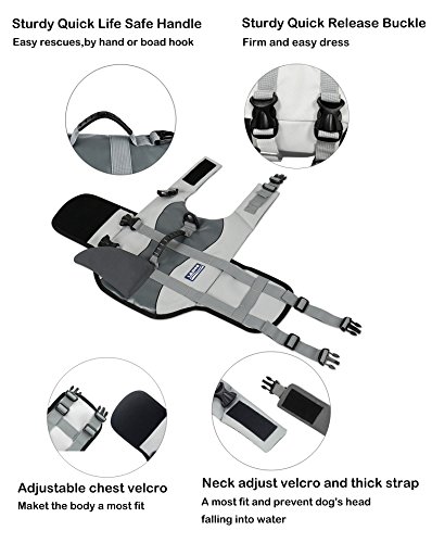 -. Feature : Dog life jacket with dual rubber cover grab handles,easy rescue,save strength