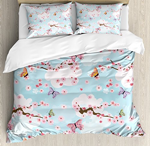 (Ambesonne)/Bedding Bath/Bedding/DIRECT FROM USA/Japanese Duvet Cover Set by Ambesonne, Spring Flower with Birds and Butterflies Freshening Subl...