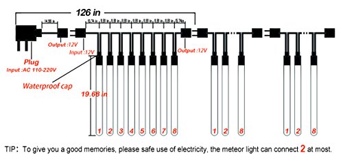 -. Feature : High quality: High quality of rigid PCB circuit boards; high brightness lights; 126inch long bold copper wire; transparent PLEDC material tube--waterproof, cold-proof(-40°C), high temperature resistance(60°C), dustproof(Hermetic), corrosion resistant, aging resistant, more durable. / Energy conservation and environmental protection: The actual power is less than 3W, you can let your room fall meteor shower. / Humanization design: The place you want to decorate but there was no support for the meteor light, it doesn't matter, our lamp holder has a hole, you can use the rope to make the light hang. If your home plug is not enough, don't worry, our meteor lights can connect each other, each three share a driver. / Belongs to your meteor shower: The light of every bulb turns on and out one by one in sequence and quickly just like meteor shower or falling snow in the night sky, very beautiful. It can be used as a whole or seperately, DIY in your own style.(No more than three mutual connection) / Application scenarios: Meteor shower lights as Christmas decorations, Valentine's Day decorations, New Year decorations, wedding decorations, party decorations, business celebration and other place; market engineering lighting,architectural decoration, decoration of trees along streets, parks, river, urban night lighting, landscaping beautifying, gardening, hotels, shopping malls, night entertainment all over the environment decoration.