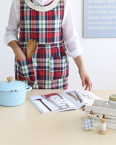 Cozymom Hood and Japanese Style Back Button Shape Check Natural Cotton Apron-2 Colors (Small & Medium Size-not Big) (Red Check)