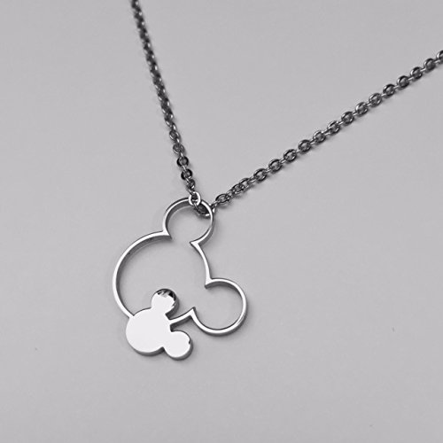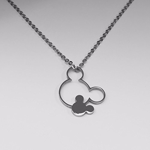 Double Mickey Mouse floating pendant on 20 inch cable link chain; made with hypoallergenic, nickel and lead free stainless steel.