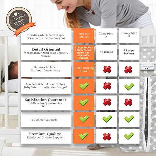 DESCRIPTIONSProduct Choices Baby Diaper Nursery Organizer is a MUST HAVE for every new parent. The perfect quality solution for organizing your baby's changing area. Avoid having to run around or leaving the changing table trying to find the diaper rash cream, diapers, wipes etc. With our Product Choices Baby Diaper Organizer there is no need to struggle or limit the table top space, using up precious space in your nursery, this space saver all-in-one organizer will make the most of your unused vertical space and keep all you changing needs in one location. Design and made of Premium quality you can enjoy the benefits of 8 compartments of varying sizes. Made to accommodate different nursery essentials, including a large diaper storage compartment, storage shelf for wipes and deep pockets for lotions, creams, burp clothes and baby's toys. Buy with Confident since Product Choices offer a 30 Days NO QUESTION ASK return police. Don't Hesitate, Buy It, Try It, If you don't like it Return it - PERIOD!