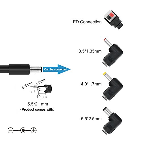 • Comes with connector: 5.5*2.15mm Gift connector: 2.5*0.7mm/3.5*1.35mm/4.0*1.7mm/5.5*2.5mm Polarity: positive (+) center