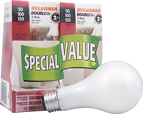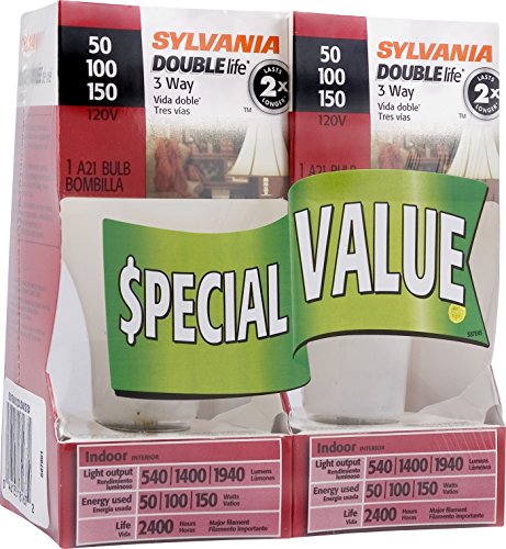 Sylvania Home Lighting 18167 Incandescnet 3-Way Bulb, A21-50W/100W/150W-2850K, Double Life, Soft White Finish, Medium Base, Pack of 2